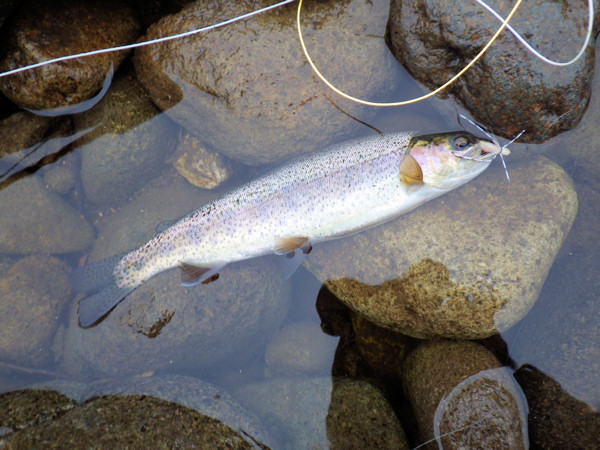 この場所はイブニングってイメージがあるのだが、まだ9時半。魚もスレてる場所だしちょっときついかな。川幅も広いので、#5から、#6のスイッチにロッドを変えていざ出陣。しかし、崖を降りる時、最後の最後で足を滑らせ、尻と右肘を強打してしまった。おー痛い。これにもめげずに川に到着。散発的にライズがあったのでドライで攻めてみるがさっぱり。やっぱダメかなと思って流しきったラインをリトリーブしていると、いきなりヒット。随分と手前でヒットした。ロングキャスト用のスイッチなのに、意味無いじゃん。上げてみると30ちょいのニジ。これも放流物だ。その後は陽も高くなり、反応もなくなったので終了する。しかし、今回は全部放流物だった。成魚放流でもしたのだろうか?昨年釣ったようなワイルドなヤツに会いたかったのになぁ。