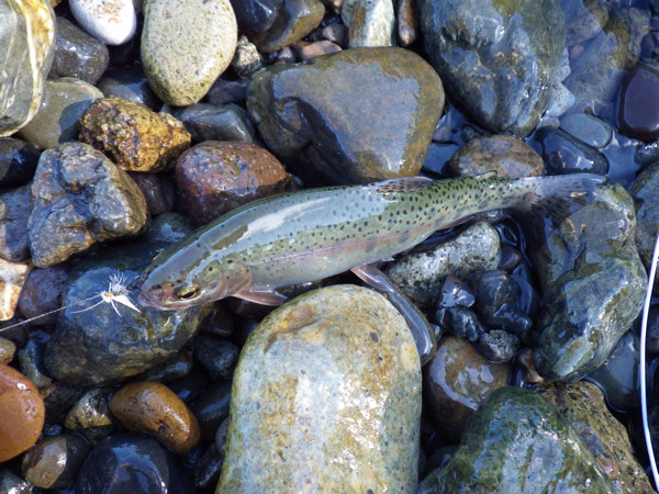 まず最初に目指したのが生田原川との合流点(写真1)。川幅が広い割に水深は浅い。どうも、ポイントらしいポイントは、合流部分くらいしか見あたらないなぁ。久しぶりにスイッチロッドを取り出し、シューティング・スペイでの釣り。しかし、どーもうまく投げれない。しかも、メンディングも上手くいかない。やっぱ、この釣り方は私には向いてないなぁ。そんなこんなで、暫くあたふたしていると、ライズを発見。でも小さそうだな。四苦八苦しながら、何度かフライを送り込むと、ようやくヒット。しかし、20センチ弱の虹鱒(写真2)。ここまで来てこんなサイズとは。私は、ロッドの長さに魚のサイズが反比例する傾向にあるなぁ。