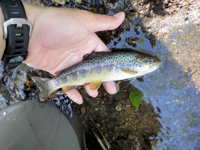 暫くここで粘っていると、対岸っぷちにまたまたライズ発見。さっきより大きそうだ。ドライに付け替え数回流すとようやくヒット。20p位のブラウン(写真3)。お、コイツは五体満足だな。この川で初めてまともなブラウン。まあ、キリもいいので、これで終了にする。