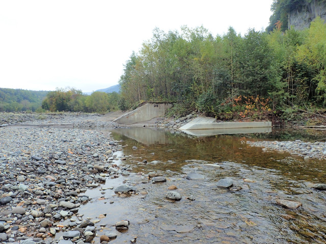 午後の目的地は然別川。堰堤がいっぱいあってあまりロケーションが良くないのは判っていたが、前回、上流に行きすぎて、きちんと川を探れなかったのでやってみたかったのだ。適当な橋の横から川沿いの道を走り、川を見て回る。まず、最初の堰堤。ふーん、あまり見たこと無い形だな。この先は?また、同じ堰堤。次は?またまた同じ堰堤。・・・なんじゃこりゃ。ずーっとこのパターンが続き、まるで同じ場所をループしているような錯覚に見舞われる。場所を決めるきっかけがつかめない。しかし、もう自衛隊の敷地横まで来てしまい、川までスロープも付いていて入りやすそうだったので、そこから入ることにする。