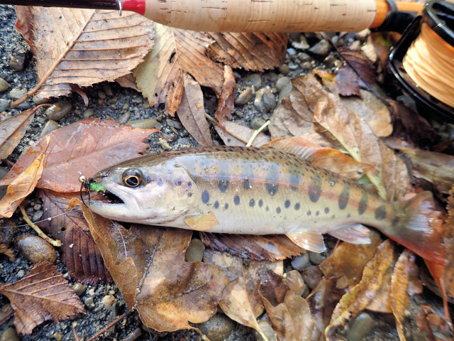 準備を終え、川に降りてみると、あら、水が少ない。春に来たときの半分くらいだ。うへー、こりゃキツいかも。まずは、前回連発した護岸沿いのポイント(写真1)。うーん、こんなに水が少なくて魚いるのかいな?ルースニングでビーズヘッドニンフを流してみると、2,3投でマーカーが引き込まれた。お!魚は居た。けど、小さいうーやん、その後3連発である。流れが緩やかになってしまって、こいつらに占拠されてるなぁ。ここのポイントを諦め、ラインをリールに回収しようとしたら、あら、リールの取っ手が無い!このリール、ドラグ性能はいいんだけど、取っ手が取れやすいんだよなぁ。10分ぐらい探して奇跡的に発見。事なきを得る。ついでに、もう一度ちょっと上の方を流してみると、ようやく本日1尾目のトラウト。指くらいの新子山女。あちゃー、この時期はこんなサイズしか居ないのかな。