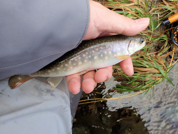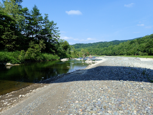 昼飯を食った後は、この際サホロも様子を見に行ってみようということで、サホロ川へ。いつもより少し上流に車を停め、いつものコースへ向かう。が、思っていたよりも結構距離があり、自分がどこに居るか判らなくなってしまった。いつも通り釣り下るが、少し水量が多く渡河しにくいな。中央が少し水深のあるポイントで、1尾目のホウライ鱒(写真4)が釣れた。更に釣り下って、ようやくいつもの入渓ポイントまでやってきたが、かなり渓相が変わっている。50アップを釣ったプールももはや存在しない。全体的に変化が少なくなった様な気がする。暫く釣り下って、2,3尾釣ったが、実は飲み物を持ってくるのを忘れてしまった。本日は30℃近くあるうえ、朝から釣りしっぱなしで、脱水気味でかなり体力が消耗してしまった。この川の状況だと、もう少し下流が本命なのだが、そこまで体力が持つ気がしない。頭から水をかぶったりして、クールダウンするが焼け石に水。右足も痛くなってきて、もうダメだこりゃ。少し早いがこれで終了とする。どうも今シーズンは行きたい時期に行きたい川に行けてない。どうにかならんかな。 |