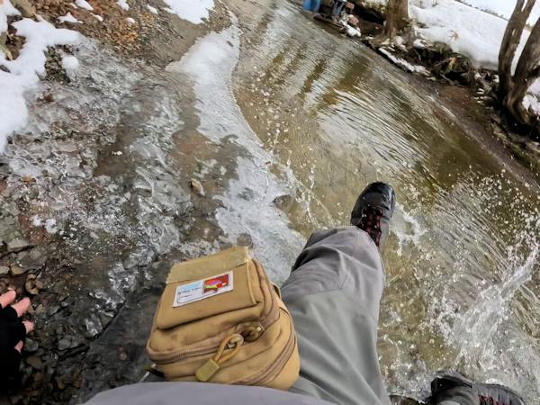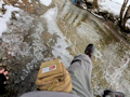 ということで、今シーズンは夕張支流でシーズンイン。いつものポイントへ向かうため畑の間の水路を歩き、「お、濁りは入ってないなぁ」、なんて考えていたら、突如、左足を何かに引っ張られ転倒。痛めている左膝をしこたま岩に打ち付けた。しばらく激痛にのたうち回る。何かと思って見てみると、木の枝の先が左足の甲に刺さり、つっかえ棒のようになって左足が前に出て来なかったのだ。何だよ、くそっ!最先悪い。さらに釣り始めようと、川岸を歩いてたら、氷でツルツルになっているのに気付かず、両足とも思いっきり滑って、背中から地面に落っこちた(写真1)。鞄を背負っていたので衝撃が吸収され大事には至らなかったが、臀部を強打し、ヘルニアのある背骨にも衝撃が走り、しばらく立てなかった。今シーズンは初っぱなからなんなの!?まだろくに釣り始めてもないのに。