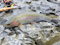 | 4月に入って、北海道の南の方は山女が禁漁となり、今日は太平洋側の方が雨が降りそうだということで、少し北上して空知川水系を攻めることにする。この時期に釣れるのか確証は無いが、寒さに強い雨鱒がいるので釣れれば良いな位の感じで決めた。今シーズン、これまで行った川は渇水状態で河川状況が余り良くなかった。なので、少し大きめの水量のある川にしようと思い、少し大きめの支流を目指して行ってみるが、ちょっと水量が多めで水も濁っていたので、断念する。もう少し小さめが良いかなと、グーグルマップを見ながら数ある支流をチェックし、一つの支流を決めてその場所に向かってみる。コンクリート護岸された小さな川だが、ちょっと面白いかも。ただ、車を停める場所が無いなぁ。駐車場所を探しているうちに、少し山の方に来てしまった。あら、橋があるな。車を降りて橋の上から川を眺めてみると、何だか丁度良い規模感の川。橋の川の名前を見てみると、聞いたこと無い川だ。車も停め放題だし、この川に入ることにしよう。街中はもう雪がほとんど無いが、ここはまだ多くの雪が残っている。早くしないと雪代が入ってくるな。さっさと着替えて、雪をかき分け川に突入。水温を測ってみると7.6℃。まあ釣りにはなるだろう。下流の方は堰堤が続いている。一番上流の堰堤下から釣り始める。堰堤直下は、底がコンクリートで変化が無く魚が居ないので、堰堤の上に移動する。少しゆったりとした深みにある流れを、ルースニングで流す。魚が居るかどうか半信半疑だったが。30分もしないうちに魚がヒット!おお、今シーズン一番重いぞ!今日は#3ロッドなので、少しやる鶏に余裕がある。とはいえ最初で最後かも知れないので、慎重に引き寄せネットイン。お−。良い魚じゃん。37pの虹鱒(写真1)。雨鱒狙いだったが、ここは虹鱒の川のようだ。続けてすぐ上流の対岸ギリギリを流していると、インジケーターにヘッド&テールで魚が出てきた。これは仕留められなかったが、複数尾の魚を確認できて俄然やる気になった。また少し釣り上がり、ちょっとした落ち込み(写真2)があったので、流心脇を集中的に流してみるが反応なし。まだ水が冷たいので、もっと緩やかなところか?今度は対岸側の緩やかな反転流を何度か流してみる。すると、インジケーターが少しずつ沈んでいく。うーん、コレは魚かなぁ?しばらく考えてからアワセてみると、ずしっとした重量感。ん?ラインをたぐり寄せてみると、激しく引き始めた。おお、やっぱ魚だ。さっきよりちょっと重いぞ。少し下流まで走られたが、コレもネットイン。さっきよりちょっと顔が大きいのでサイズアップしたかと思ったが、全く同じサイズの37pの虹鱒(写真3)。よしよし。この時期にこのサイズ2本は十分満足じゃ。その後は反応も無く、リーダーを木に引っかけて切れてしまったので終了することにした。満足しちゃったので、食べ歩きに切り替えじゃ。ここはもう少し暖かくなったらまた来てみよう。盛夏だと藪と渇水で厳しそうだが、雪が無くなったらドライでチャレンジしてみたいぜ。 |
