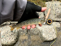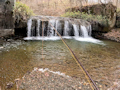 回復を待って、ようやく釣り開始。先ほど打った膝がかなり痛いので、釣れなさそうならすぐに止める所存。しかし釣り始めてすぐ今シーズンの初フィッシュをゲット。水がかなり少ないので、岩盤の抉れとかに魚がまとまっているようだ。同じ場所でちょくちょく釣れたり、魚影を幾つか確認した。で、魚が良く付いている小滝ポイントで本日最大の1尾が釣れた(写真2)。ま、25弱ってところだし、スレだったけどもね。